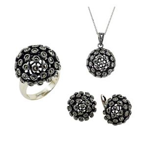 925 ayar gümüş üzerine oksitli ve otantik tasarım, toplu model markazit taşlı bayan gümüş üçlü takı seti. Kolye, küpe ve yüzükten oluşan markazit taşlı bayan gümüş üçlü takı seti markazit taşlarla bezenmiş ve eskitme yapılıp tamamı 925 ayar gümüşten üretilmiştir. Küpenin kilit kısmı İngiliz kilit sisteminde üretilmiştir. Bu nedenle kolay açılıp düşme yapmaz. Osmanlı dönemi takılarından ilham alınarak tasarlanmış olan bu otantik ve markazit taşlı gümüş üçlü takı setini takmaktan büyük keyif alacaksınız. 925 ayar gümüş ve otantik, markazit taşlı gümüş set her kadının vazgeçemeyeceği şık bir tasarımdır. Her zaman severek kullanabileceğiniz ve sevdiklerinize hediye edebileceğiniz mükemmel bir tasarımdır. Zincir dahil fiyattır. Diğer gümüş otantik üçlü takı seti modelleri ve fiyatları için otantik set kategorimizi ziyaret edebilirsiniz.
